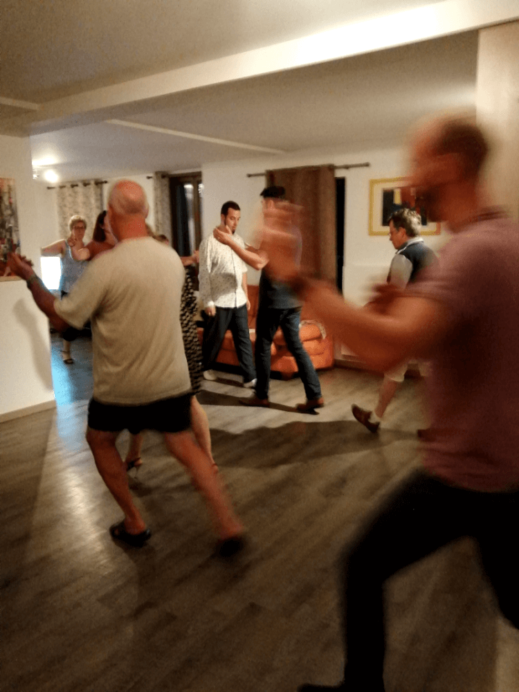 Dans la joie et la bonne humeur, après un p’tit apéro préparé par Christine, pour la mise en jambe…direction la salle pour découvrir le Tango en compagnie de Valeria et Damien.